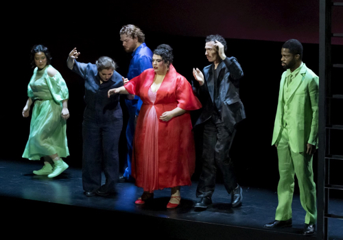 Durant l’ouverture, l’équipe rembobine le fil des événements. Choristes et solistes, mêlés dans une uniformité de caleçons, soutiens-gorge et nuisettes, laissent à chacun, dans la salle, le soin de deviner quel corps chantera quoi. Puis, selon un ordre de préséance inversé, les rôles s’habillent peu à peu de vêtements colorés signés Sophie Klenk-Wulff : élégants et vaporeux, ces costumes ne cesseront de capter le regard – le vert printanier de Zerlina et Masetto, l’écarlate impérieux de Donna Elvira, le noir austère de Donna Anna, l’indigo d’Ottavio.