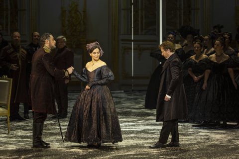 Peut-être guidé par un raisonnement de ce genre pour sa première mise en scène d’opéra, l’acteur Ralph Fiennes propose un spectacle qui rappelle les très respectueuses adaptations littéraires de la BBC, au moins par le soin apporté à ses costumes historiques. Pour le décor, en effet, Michael Levine s’efforce de ne pas reproduire à l’identique celui qu’il avait conçu en 1997 pour Robert Carsen au Met, mais on retrouve tout de même ces très hauts bouleaux et ce sol jonché de feuilles mortes. Et si Ralph Fiennes déclare viser le réalisme, il ose parfois s’en éloigner, comme au troisième tableau, où les cueilleuses de fruits sont remplacées par un groupe de silhouettes diaphanes coiffées de kokochniks qui semble sorti de quelque peinture symboliste russe, et surtout lors du bal chez les Grémine, où l’on danse dans la neige (curieusement, personne ne s’est soucié de la balayer pendant l’entracte) et où les soldats se métamorphosent en ours le temps d’une écossaise. Le résultat est indéniablement très beau, les déplacements du chœur sont parfaitement réglés, mais on regrettera juste un léger déficit sur le plan du théâtre, sur un plateau qui avait accueilli, dix-huit ans auparavant, la stupéfiante production du jeune Dmitri Tcherniakov.