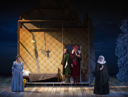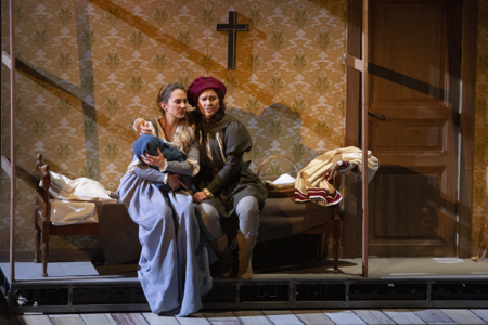 Inutile de consulter la « Note d’intention », car elle est à peu près totalement dépourvue de ce qui pourrait ressembler à une intention. Ce qu’on voit sur scène inclut de très beaux décors en toile peinte, merci à Rudy Sabounghi, mais des techniciens sont très ostensiblement présents pour les déplacer, et quand ils les retournent, on découvre des intérieurs sans rapport avec ces bâtiments antiques : la chambre de Marguerite inclut notamment une suspension à ampoule électrique et un papier peint années 1970. Les costumes citent l’art de la Renaissance germanique et italienne, mais la kermesse impose aux membres du chœur une gestuelle rappelant des tubes populaires tels que « Agadou dou dou, pousse l’ananas et mouds le café », œuvre commise par Patrick Zabé en 1975. Lorsqu’il apparaît en scène, Faust traîne comme un boulet un paquet de livres qui pourraient lui servir de lest s’il choisit de se suicider par noyade, et l’on voit passer un faucheur qui pourrait être la Faucheuse, mais toute dimension fantastique est en fait évacuée. On se sert aussi beaucoup de chariots à la Luca Ronconi (les seventies, encore une fois), et Marguerite est ainsi promenée au milieu de la foule en liesse comme une personnalité publique qu’on acclame, Méphistophélès ayant utilisé le même véhicule pour faire son entrée au deuxième acte. Difficile de dégager un sens cohérent de tous ces éléments contradictoires qui semblent vouloir offrir au public les plaisirs d’une représentation à l’ancienne tout en donnant quelques gages de modernité, de distanciation indiquant que l’on n’est pas dupe.