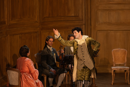 Si les charmants costumes pastel, habits à la française et robes à la polonaise, évoquent l’univers de Fragonard, on reste très loin du Verrou. Après l’entracte, on craint que cela continue dans la même veine : Junon sert le thé à ses visiteurs au lieu de donner libre cours à son indignation face à cette énième tromperie de son époux. Heureusement, les choses se corsent bientôt, Calisto est humiliée, Endymion est malmené, la soirée décolle enfin, et un coup de théâtre imprévu survient dans les dernières minutes.