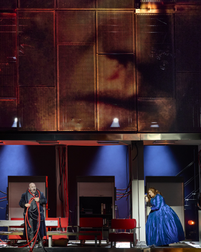 Au deuxième acte, la dispute Fricka - Wotan se déroule dans un data center : les grandes armoires contiennent non des serveurs mais des dossiers et des sorties d’imprimante, tandis qu’un enchevêtrement de câbles, avec lesquels le roi des dieux joue à s’étrangler, développe la métaphore technologique. Au milieu de ce chaos, Fricka —somptueuse dans sa tenue bleu glacier signée Ingo Krügler — incarne une impitoyable maîtresse femme. Ève-Maud Hubeaux savoure le rôle et torture son époux avec un plaisir évident.