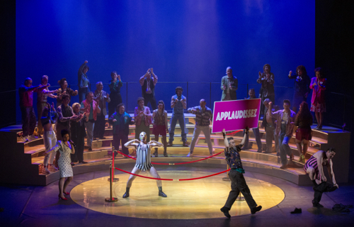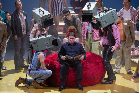 Confrontée à ce livret difficile, Sol Espeche a choisi de poursuivre son exploration de l’univers télévisuel des années 1980-90. Même si le rapprochement s’impose de façon moins évidente que le lien qui unissait Coups de roulis à La Croisière s’amuse et au soap opera, on ne peut nier la virtuosité ingénieuse avec laquelle l’idée est exploitée, alors que se bousculent les références à différentes émissions de divertissement qui ont connu leur heure de gloire à la fin du siècle dernier, des shows de variétés à la téléréalité : on trouve ainsi, pêle-mêle, « La Classe », « Champs-Elysées »d, « Tournez Manège » et « Loft Story », l’enfer où l’on est condamné à danser pour l’éternité ressemblant furieusement à « Gym Tonic ».