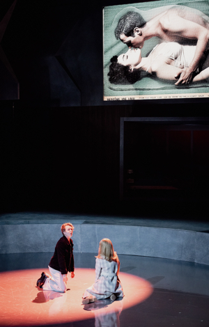 Il y a néanmoins des longueurs, et malgré toute l’habileté avec laquelle Bassem Akiki dirige cette partition pour grand orchestre, la mise en scène confiée à Anna Smolar n’aide pas vraiment à les dissiper. Dans cette production « Chloé-centrique », tout se joue à travers le regard de ce personnage féminin, présent sur scène d’un bout à l’autre du spectacle, dédoublé entre passé et présent, et projeté sur grand écran. A l’euphémisme de Vian (le nénuphar dans le poumon), la production substitue la réalité crue d’une malade en stade terminal du cancer qui choisit de se donner la mort. Quant aux amours de Chloé et de Colin, il ne s’agirait que d’une histoire fantasmée, puisque Chloé est en réalité en couple avec « la Souris », l’animal du roman devenant ici une femme qui partage le quotidien de l’héroïne. Aux années 1940 de Vian, le spectacle préfère de déplacer le poids du passé vers les très warlikowskiennes années 1970 finissantes, à en juger d’après les costumes, et les parois du décor gris béton s’envole peu à peu, envahi au dernier acte par une gigantesque fleur dominant le plateau. La présence de danseurs et d’un magicien est justifiée au nom d’une évocation de l’univers intérieur de Chloé, mais elle crée une agitation que l’on pourrait être tenté de prendre pour un certain manque de confiance envers le discours musical, jugé inapte à soutenir l’attention.