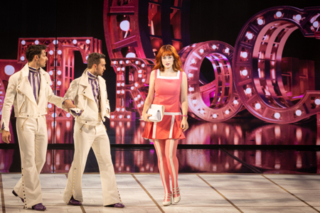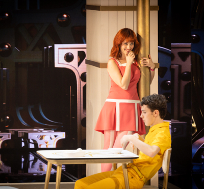Si vous doutez encore que les frontières entre opéra et comédie musicale puissent être poreuses, ses représentations devraient achever de vous convaincre. A qui a-t-on confié la scénographie de ce nouveau spectacle ? A Bruno de Lavenère pour les décors et à Etienne Guiol pour les vidéos, soit exactement le tandem qui vient de brillamment réussir Satyagraha à l’Opéra de Nice ; le premier est désormais bien connu des amateurs d’opéra, pour ses nombreuses collaborations, notamment avec Laurent Pelly, et le second a eu l’excellente idée de ne surtout pas concurrencer le film de Jacques Demy, en évitant de nous montrer des vues de la véritable ville où est censée se dérouler l’action. A part les images du pont transbordeur qui ouvrent et ferment la soirée, les parois du fond de scène montrent essentiellement d’énormes majuscules formant le nom de Rochefort, constellées d’ampoules lumineuses. Conformément au scénario, qui passent constamment d’un lieu à l’autre, le décor se transforme constamment pour transporter le public de l’appartement des sœurs Garnier au café de leur mère, en passant par la boutique de Simon Dame ou la galerie d’art de Guillaume Lancien, entre autres. Les costumes d’Alexis Mabille reprennent pour l’essentiel le look Courèges qui fait désormais le charme désuet du film, en privilégiant différentes nuances de violet pour habiller les forains et Andrew Miller, mais en lorgnant aussi un peu sur les années 1970 et sur le disco.