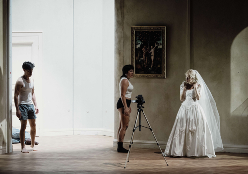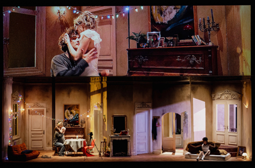 Cinq personnages, ou plutôt quatre puisque le cinquième n’a guère que quelques phrases à chanter, c’est à peine plus que dans Huis clos de Sartre, pièce à laquelle on pense assez inévitablement en assistant au spectacle monté par Matthias Piro : tout, en effet, se déroule non pas simplement dans la chambre où cohabitent Paul et Elisabeth, mais entre les murs d’un grand appartement presque haussmannien, qui inclut notamment le salon bourgeois, antichambre de l’enfer où Sartre enfermait ses personnages. L’enfermement éclate néanmoins ici grâce à un balcon ouvert sur l’extérieur, et surtout grâce à une tournette très sollicitée, qui permet de parcourir les différentes espaces dudit logement (les premières minutes de la représentation incluent même un agent immobilier faisant visiter les lieux, le drame étant dès lors non pas narré par un récitant, mais revécu par l’un de ses protagonistes. On comprend en lisant le programme de salle que le « jeu » qui unit Paul à sa sœur Elisabeth est ici devenu l’habitude de se filmer, ce que les deux autres personnages font également, avec projection au-dessus du décor, tantôt d’images en direct, tantôt de films préexistants (le procédé fonctionne très bien pour le rêve de Paul qui croit revoir sa mère morte, et pour l’évocation de la bataille de boules de neige qui déclenche les événements, mais il semble plus gratuit à bien d’autres moments).