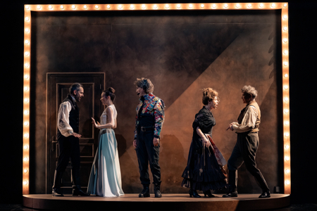 Pour mettre en scène ce musical pas comme les autres, Olivier Bénézech a choisi de rendre hommage au genre lui-même, en imaginant que les cinq personnages participaient à une production de Sweeney Todd du même Sondheim (dont on entend d’ailleurs un air au cours de la soirée). Dans le décor faussement simple mais réellement élégant de Bruno de Lavenère, tout s’enchaîne avec fluidité, entre scène et coulisses – et même dans les toilettes ! Sous la direction de Thierry Boulanger, l’Orchestre de l’opéra de Toulon interprète avec une belle énergie ces morceaux qui rendent souvent hommage à l’âge d’or de la comédie musicale, tout en empruntant à différents univers sonores.
