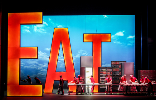 On ne s’étonnera pas que la mise en scène rapproche l’action de notre époque : du foyer de Sir William Crusoé, Laurent Pelly fait un appartement british dans un camaïeu de verts (on se croirait presque dans un épisode de Derrick) où le héros se morfond dans le délicieux ennui distillé par ses parents, malgré la présence de sa cousine Edwige, de la bonne Suzanne et de son ami Toby. Caricature exquise, gestes et mimiques « pellyens » mais auxquels on se laisse prendre sans la moindre résistance (Ah, cette petite danse de colonie de vacances sur « C’est aujourd’hui dimanche »!), le premier acte passe comme une lettre à la poste. L’Amérique où échoue Robinson est une sorte de Californie dystopique, où les SDF campent au pied des gratte-ciels. Les anthropophages travaillent dans un abattoir moderne, et la tribu adoratrice du dieu Saranha paraît bien républicaine… A l’issue du deuxième acte, le sourire est sur toutes les lèvres, et seuls quelques trumpistes égarés hueront l’équipe artistique lors des saluts. Survitaminée, la direction de Marc Minkowski sait exalter aussi bien les beautés symphoniques que prodigue Offenbach évoquant le monde nouveau, mais il imprime aussi ses Musiciens du Louvre toute la frénésie requise dès l’ouverture. Le chœur accentus accomplit superbement son travail, dansant aussi bien qu’il chante, qu’il soit sauvages ou matelots.