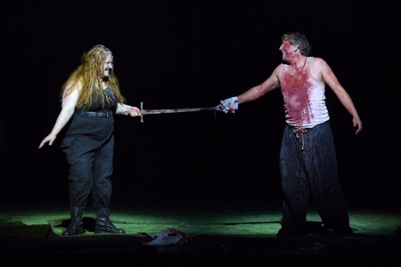 La trivialité s’impose ailleurs, comme lorsque Erda et Wotan se disputent violemment autour d’une soupe de sable, le dieu des dieux asservissant la Terre-Mère dans une scène de violence conjugale bien convenue. Dans ce même troisième acte, Siegfried découvre enfin qu’une épée se tient par sa garde et non par sa lame, lorsqu’il doit briser le bloc de glace où repose la vierge gelée. Fidèle à la légende, il se sera auparavant baigné dans le sang du dragon après s’être barbouillé d’argile verte. Triste couple, et sans la moindre poésie, que cette femme Hibernatus et cet homme poubelle.