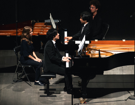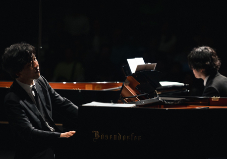 Même costume, même chevelure noir de jais, coiffure et taille quasi identiques, ils ont une étonnante allure de Men in Black. Mais les deux Sud-Coréens Yunchan Lim et Minsoo Sohn ne viennent pas à La Roque d'Anthéron pour chasser les vilains extraterrestres mais pour présenter un étonnant programme à deux pianos. Ils ont pour cela choisi, parmi les neuf modèles mis à disposition par le festival, un Bösendorfer et un Steinway. La disposition des deux instruments côte à côte et non tête-bêche comme on en a l’habitude permet d'aligner leurs touches en un imaginaire clavier sans fin, celui d'un orchestre pour doigts.